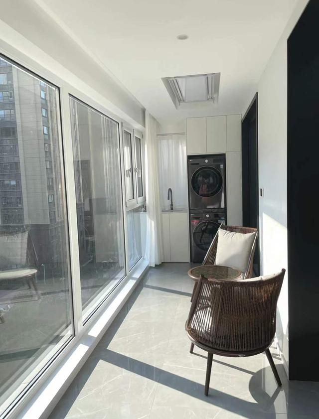 整个阳台长6.8m,为双阳台。洗衣区设计在右边。洗衣柜定制,预留洗衣机和烘干机的叠放尺寸,视觉上融为一体。智能衣架设计在天花板上,隐形不影响美观。多功能实用。