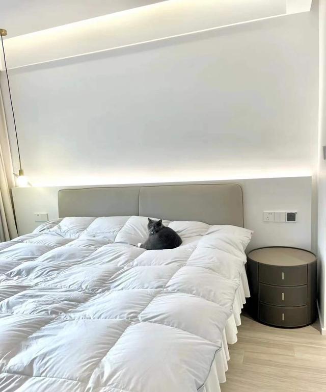 卧室做了吊顶的设计,内嵌灯带和床头床头板。嵌入式灯带无论是白天还是夜晚都充满高级感,营造出十足的氛围。使用了皮革床,柔软的表面和光滑的手感给人带来了高贵的质感。与床相一致的意式皮质床头柜,颜色不错。三层存储可以用来放置常用的对象,增加了存储空间。皮革材料很容易打理。