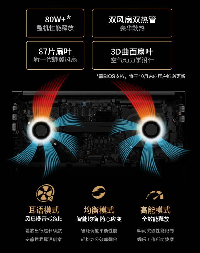 笔记本电脑高效的性能往往会带来巨量的积热,但是你完全不用担心灵耀Pro16会有这个问题,双风扇双热管,87片扇叶,3D曲面扇叶,Fn+F快捷调节风扇模式不仅能让使用感受凉爽,还可大大降低日常运行噪音。