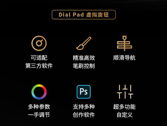 全新功能DialPad虚拟旋钮,可完全代替鼠标完成多项操作,点涂、拖拽,也可当笔刷进行创作,可适配第三方软件,精准高效笔刷控制,顺滑导航,多种参数一手调节,支持多种创作软件。