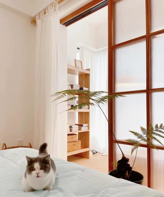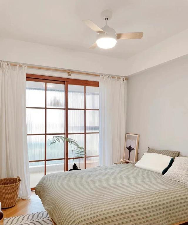 这间卧室与茶室相连。用的是长虹玻璃,有透明的,也有不透明的。一开门就可以喝杯茶,看风景。悬挂式轨道不会刮伤地板,清洁起来也很方便。虽然是实木的,但是用了这么久,稳定性还是很好的。