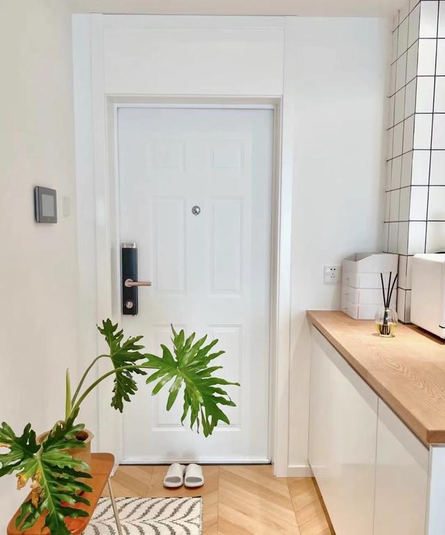 原来的户型玄关采光不好,两边都是墙。敲掉厨房墙壁后,玄关一片光明。入户门右侧离墙空间不大,不可能是鞋柜。厨房附近做一个矮柜,鞋柜对着玄关,收纳柜对着厨房。台面也是共用的。厨房里放着厨房小家电,可以当吧台用。