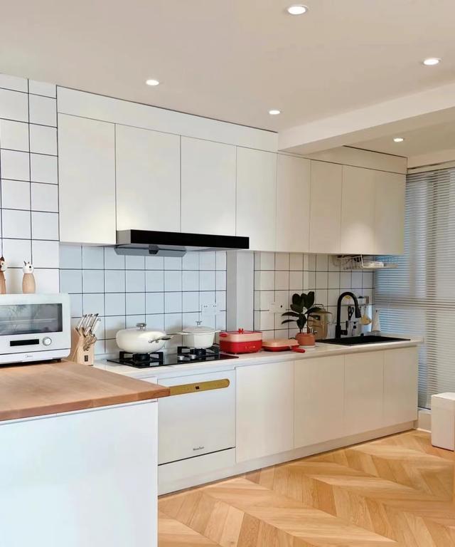 改造成开放式厨房后,改善了多个空间的采光问题,厨房的空间变得更加方便。厨房整体颜色为白色,让厨房看起来更加干净整洁。