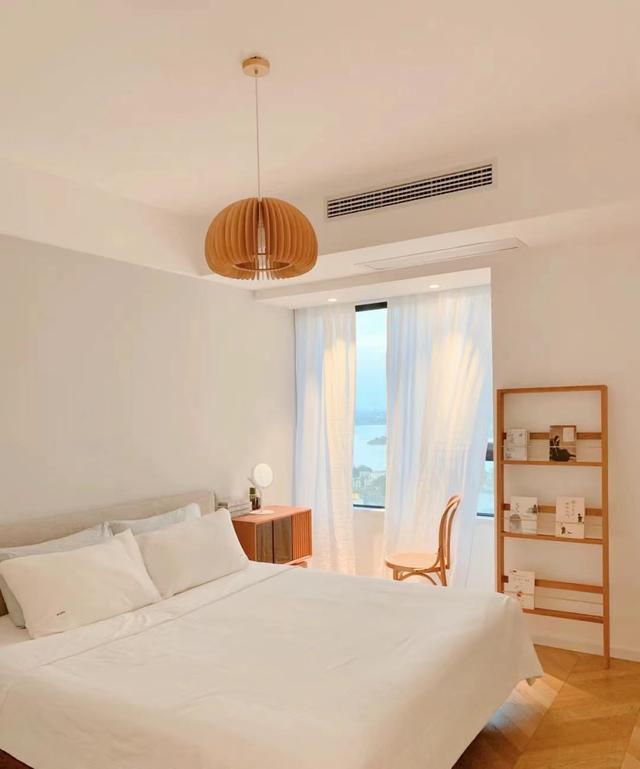 硬装很简单。地板采用多层橡木色鱼骨,墙面大面积留白。只刷了浅灰色的床头背景墙,接近白色。