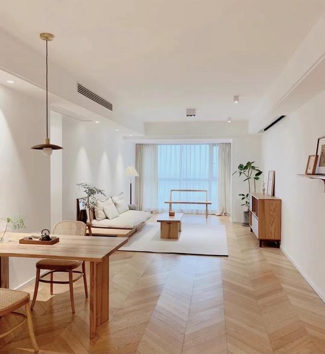 大面积木地板铺装,视觉空间更加舒适宽敞。家里没有造型墙,四面都是白色,怕太淡。我选择了有气质的鱼骨造型,让空间有更强烈的立体感和延伸感。