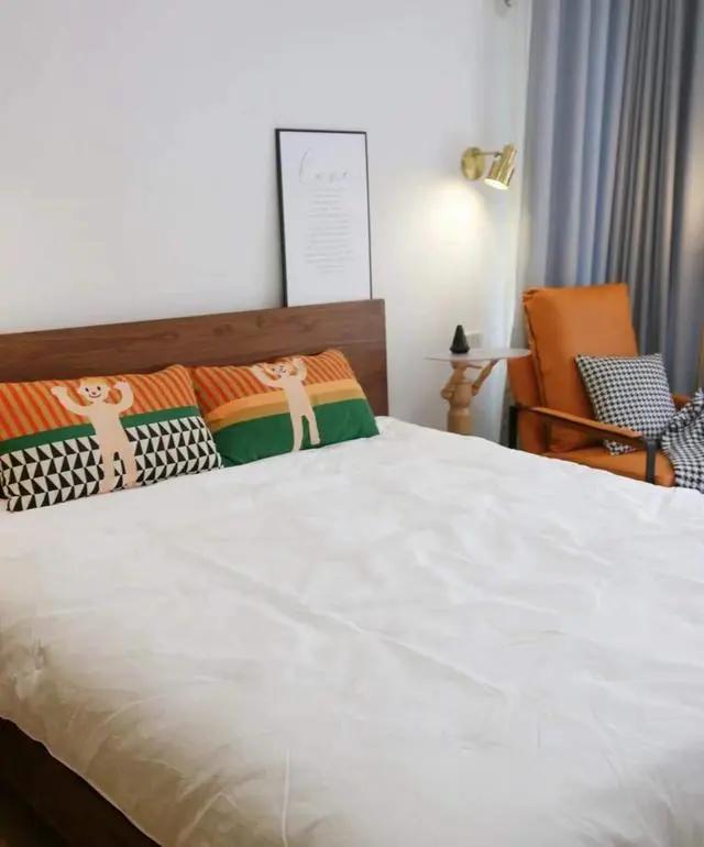 主卧的装修风格也很简洁,基本的硬装少了,没有吊顶和软包,还是四层白色。光源是普通吸顶灯、床头灯和落地灯的组合。