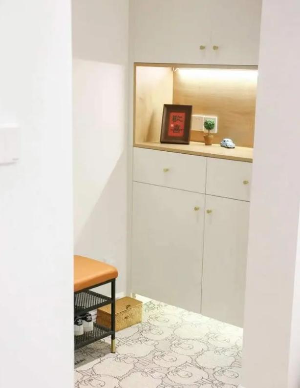 配套的换鞋凳也很适合。橙色不仅点缀了空间色彩,还利用下层两层隔板的设计,放置日常更换的鞋子,方便实用拿取。