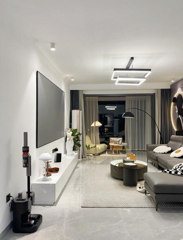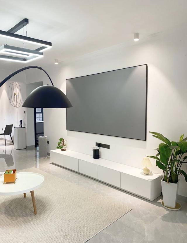 有了大白墙,还有110寸的窗帘和3米长的落地电视柜。从整个电视墙的视觉效果来看,这样一个“乳胶漆幕(投影仪)极简电视柜”的方案似乎更高级一些。