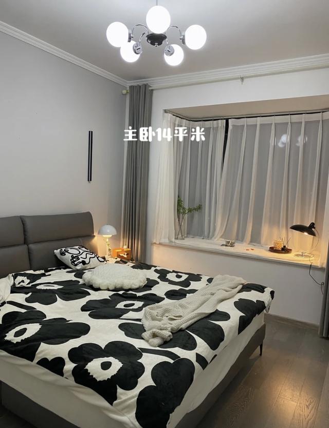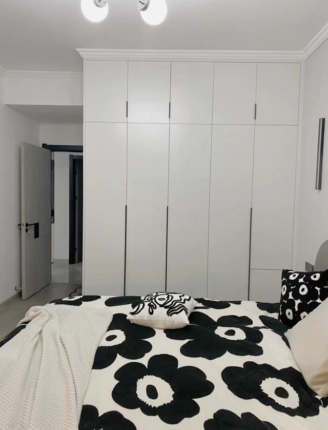 主卧装修还是坚持不吊顶,不做软包背景墙。取而代之的是10 cm的石膏线和浅灰色乳胶漆。