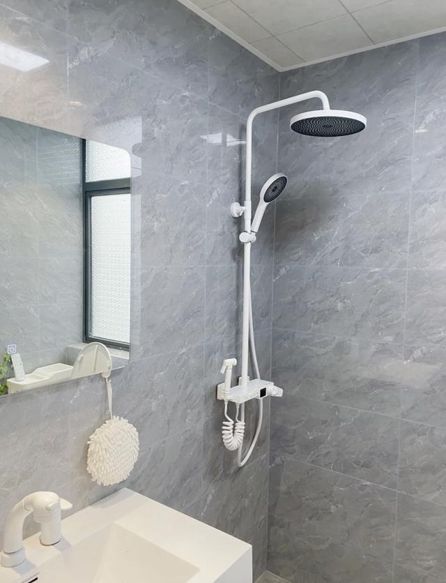 在浴室花洒的选择上,我们选择白色恒温花洒,而不是大众化的黑花洒。事实上,选择白色淋浴是明智的。毕竟如果不装中央软水机,城市自来水里的水垢多到无法想象,黑淋浴根本挡不住。