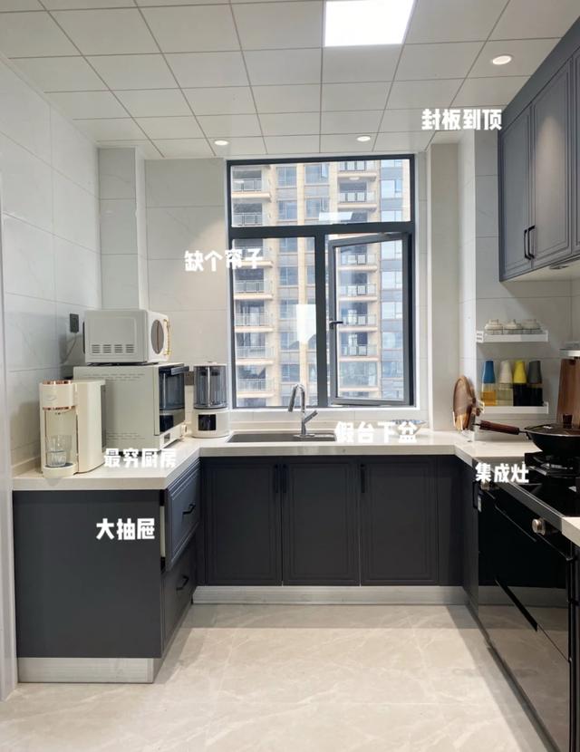 另外,厨房的吊顶并没有选择现在流行的石膏板吊顶和蜂窝吊顶,而是最传统的铝扣板。其实这种纯白哑光铝扣板的颜值并不低,关键是经济实用。