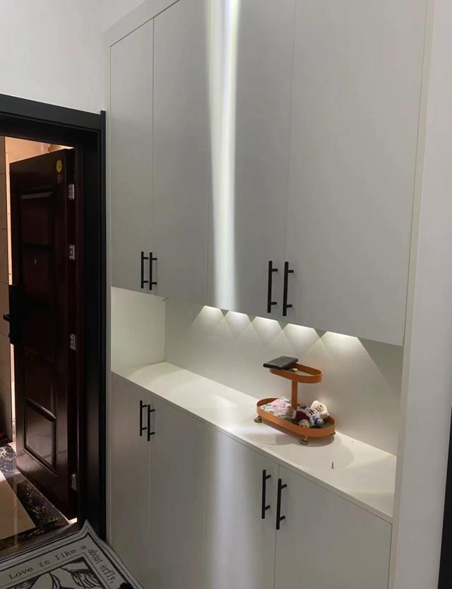 因为玄关柜子原来的把手容易碰到孩子的头,女主人自己直接把原来的把手改成了皮把手。这真的是难能可贵。正如网友所说,“这种精致真的不是每个人都能做到的”。
