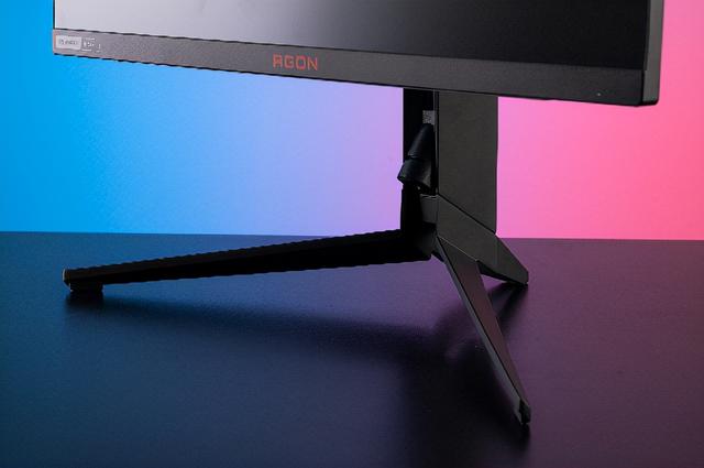 AGON AG254FG的正面非常简约,采用了三面微边框设计,边框只有1.5mm厚,即使是算上窄画面黑边也只有4.6mm,带来了更好的沉浸式体验。下边框也没有多余的繁杂设计,只有中间一个红色AGON LOGO。显示器背部采用黑色咬花注塑工艺,做工精致。四边倾斜设计,显得颇具动感,右侧还配备了一个伸缩式铝合金耳机挂钩,方便玩家放置电竞耳机。