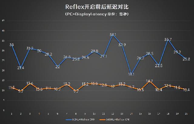 我们使用“360Hz/Reflex ON”和“60Hz/Reflex OFF”两种状态进行延迟对比测试。测试时用鸟铳连续射击20次,对比两种状态下的延迟差距。