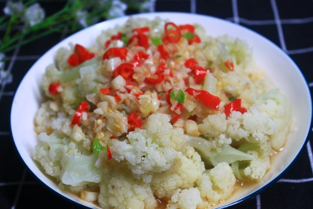 3、蒸好的花菜,摆入盘中,淋上炒好的料汁即可。