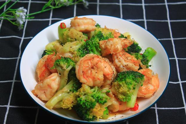 锅中倒油,放大虾翻炒变色,然后倒入西蓝花翻炒,加少许(盐、胡椒粉)翻炒均匀即可出锅。