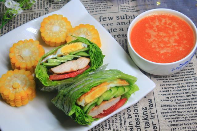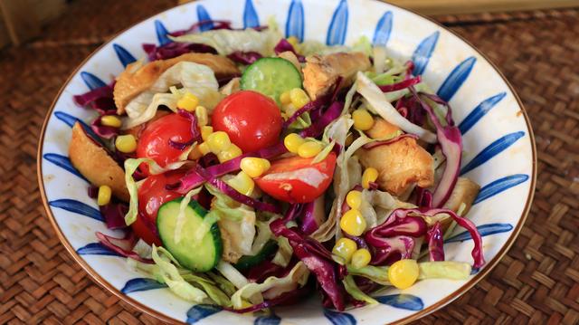 主要食材:紫甘蓝、生菜、小番茄、玉米粒、黄瓜、鸡胸肉