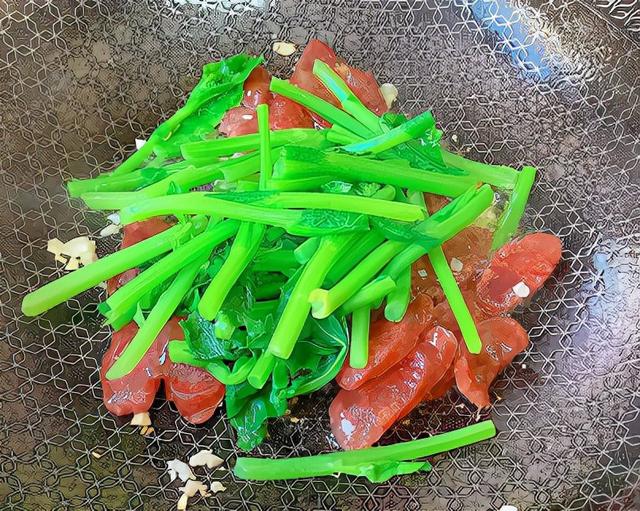 第五步、然后倒入菜梗,翻炒几下,最后再倒入菜叶,加盐、味精简单调味即可,不需要太多的调料,保留菜薹的原汁原味。