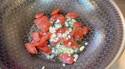 第四步、锅中倒油,放入腊肠煸炒出香味,接着放入蒜末炒香。