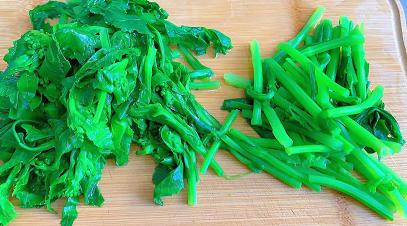 第三步、焯水后的菜薹过一下凉水降温,然后把根部和叶子切开,这也是好吃的关键,因为根部和叶子成熟度不一样,分成炒最好。