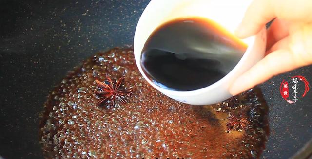 4、锅里放入一撮花椒,两个八角,然后开火将香料炒出香味,倒入一小碗香醋150克,一碗生抽200克左右,再放入几颗冰糖,大火煮到冰糖融化,煮上2分钟后关火放凉。