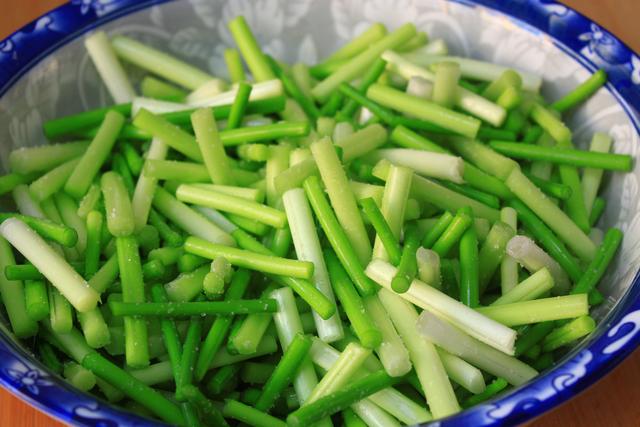 2,准备一把韭菜洗净后,去掉老的根部,然后切成小段,生姜切成细丝,大葱斜刀切片,切好备用。