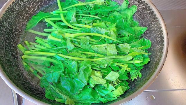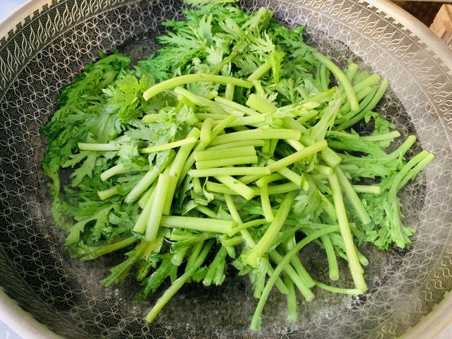 2、锅中烧水,加入盐、食用油,放入茼蒿焯水30秒左右,加盐的目的是为了增加底味,加油为了让茼蒿更加翠绿。焯熟后捞出控干水分。