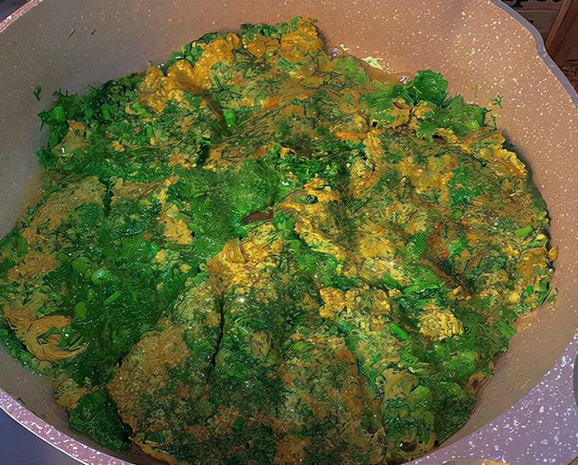 4、开中小火煎,火不要太大,要不然鸡蛋焦了就不好看了,等到底部凝固变得金黄,然后翻面,因为这个茴香鸡蛋比较软,整个翻面不容易,我们用铲子从中间分开,一块块翻面,这样相对比较容易一些。