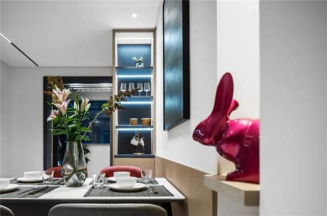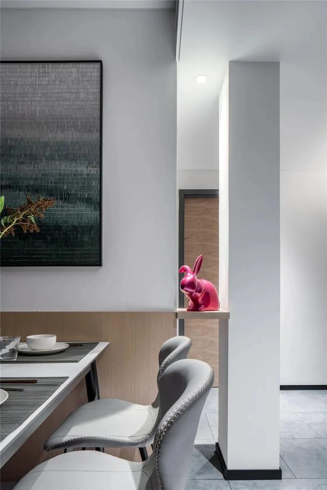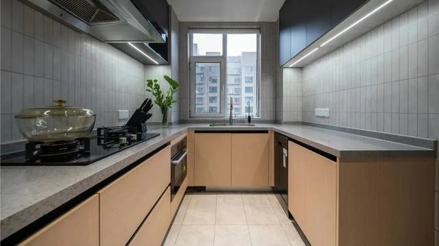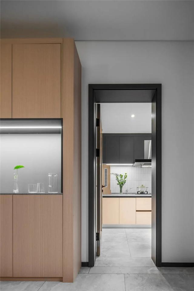 同时,在吊柜下方,还增加了感应灯带,这样晚上就不用摸黑做饭了,使用感更人性化。从餐厅区看厨房,可以看到明亮舒适的氛围,日常生活需要柴米油盐酱醋茶,更需要温馨舒适的氛围,这是本案设计的核心。