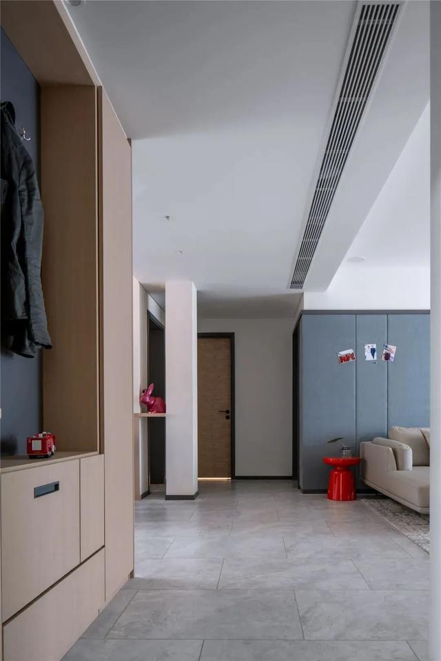 玄关区的设计以功能性为主,原木风玄关柜,可折叠的换鞋凳,超大的收纳空间,让玄关区简洁大方。