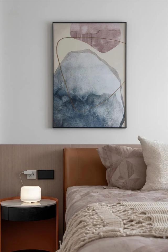 主卧空间的改造,简洁大方。半墙靠背,内嵌灯带,营造出清朗舒适的氛围。有了挂画的装饰,主卧更简洁,更舒适。