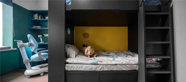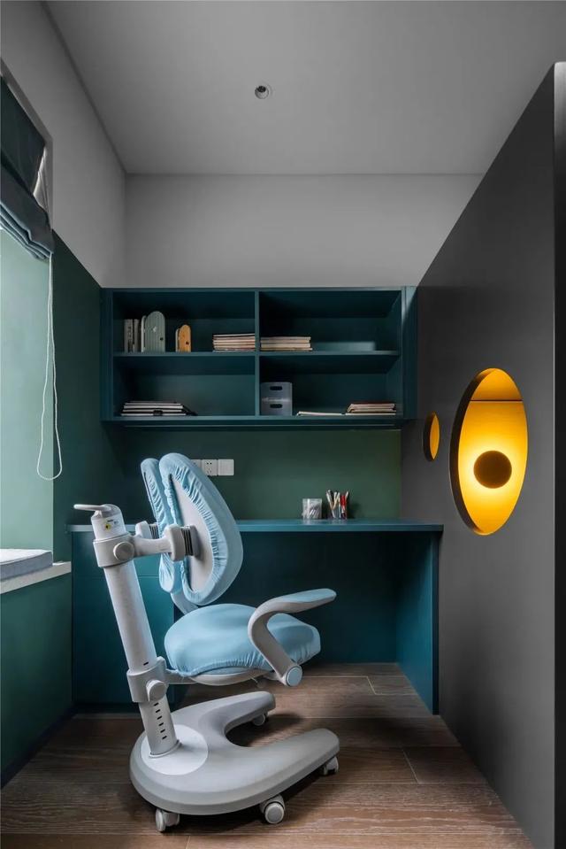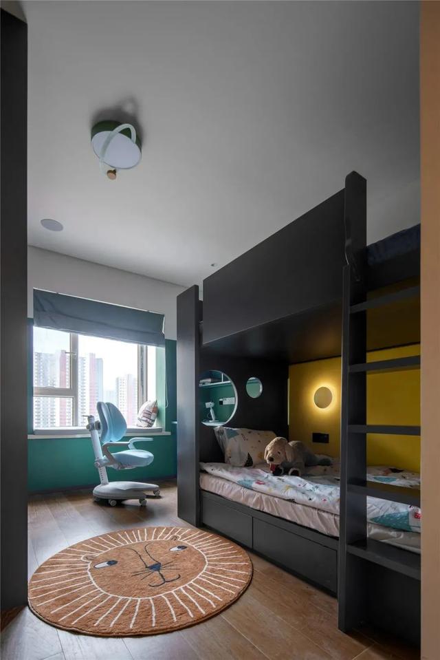 改造后的儿童房以定制的双层床为设计亮点,跳跃的蓝绿黄色调和灯光装饰,为家里的两个小男孩营造了一个充满梦幻童趣的空间。