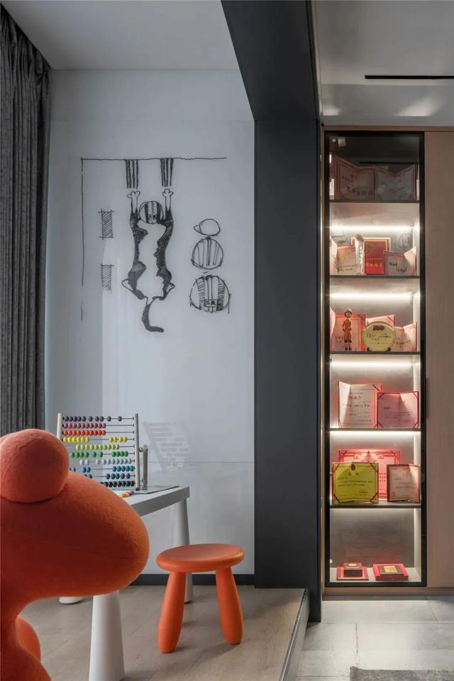 平台的一侧与电视柜相连,设置了荣誉展示墙,上面是男主和孩子的奖状和证书,也可以算是家中的一个展示点。