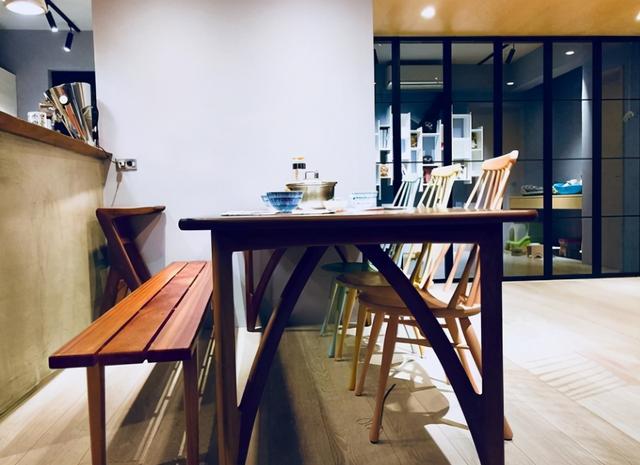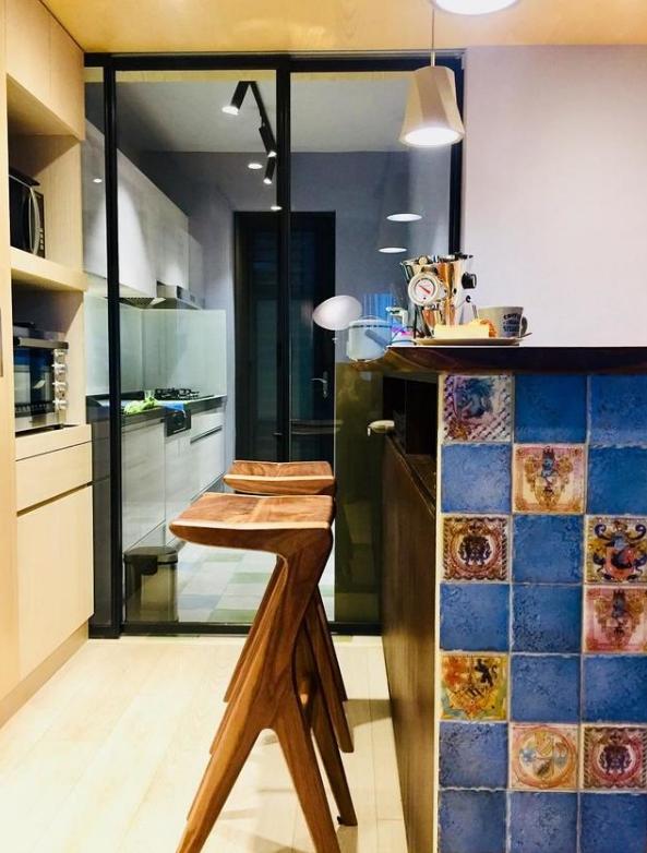 原来封闭厨房改为开放式厨房,增加了很多艺术感的花砖,操作区还是这个玻璃推门员油烟阻隔在外。木制的特色餐椅和小吊灯,接踵而至的是充满烟火气息的厨房温馨感。