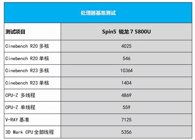 从数据测试来看,Spin5的锐龙7 5800U处理器性能表现相当强力,体现出了8核16线程处理器的巨大优势,在大家熟悉的Cinebench R20多核中,其多核测试成绩为4025,这是非常高的跑分,甚至已经领先游戏本的标压6核12线程处理器成绩,而Spin5仅仅是一台1.2kg的触控翻转本。同样的还有Cinebench R23多核、CPU-Z 多线程、V-RAY基准等测试,Spin5所搭载的锐龙7 5800U均是分数狂飙。所以,更多的跑分测试也就没有必要再做了,对于该机而言,锐龙7 5800U的性能表现已经不言而喻,依然是目前轻薄里稳定的第一级别。