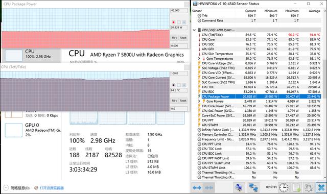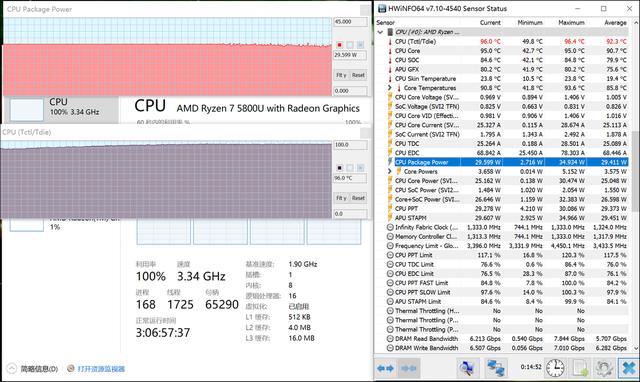 如果在温度较低的环境下考机(冬天重庆室内自然温度,大约10℃),锐龙7 5800U可以跑到30W左右,频率上升到3.3GHz,处理器的温度则是96℃。看来该机应该在机身上布有温度传感器,为了保证各种模式下用户的使用体验不受影响,在处机身热量堆积到一定温度时会限制处理器功耗。