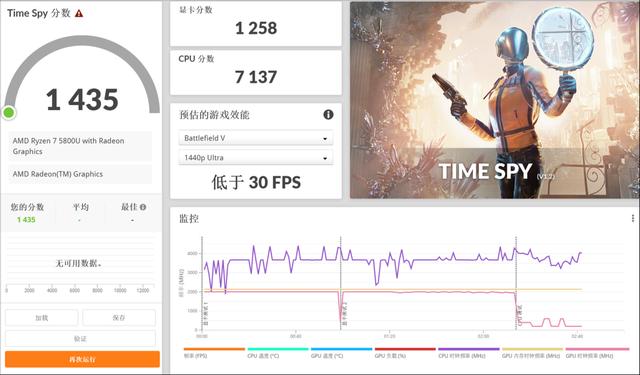 娱乐性能方面,锐龙7 5800U内置8核心的 AMD Radeon Graphics GPU,显卡频率2000MHz,而该机突出的一点是搭载了双通道16GB LPDDR4 4266MHz高频内存,能更好地发挥集显性能。比如在下图的3DMark Time Spy测试中显卡得分为1258,稍微超出3200MHz内存的集显成绩。当然,在实战性能方面,作为集显,虽然内存频率提升了不少,但总体还是属于LOL等轻度游戏娱乐的水平。