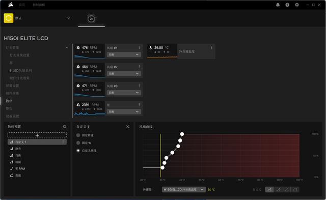 在我们熟悉的iCUE控制软件中,能实时地监测风扇、水泵转速、水冷液温度等数据,同时也能对散热器运行模式以及灯效进行调节。灯光效果设置中,支持单独调节每个风扇、灯环、LCD显示屏的RGB灯光效果,其中光是RGB风扇就拥有多达18种的预设灯光模式,各种选项的自定义程度也是非常高的。而水冷头的LCD显示屏除了常规的系统信息和温度显示外,也可以显示用户自定义的GIF动画与图片,从实际的使用上看,这块屏幕的亮度表现和画面显示精细度的确不错,拥有十分酷炫和个性化的效果。