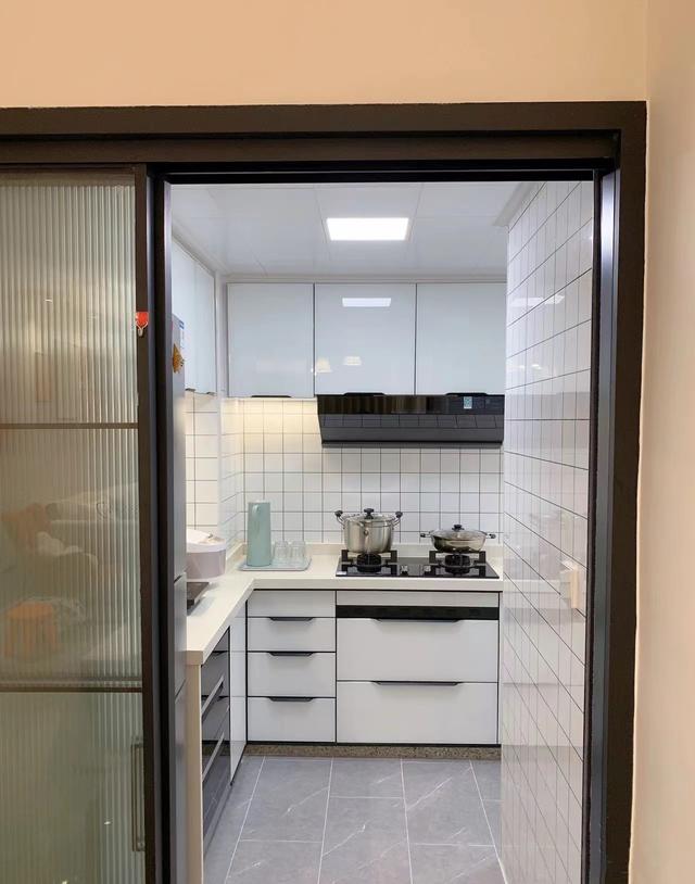 厨房用长虹玻璃门隔断,不占空间,透光,还能阻隔油烟。L型柜体布局合理,储物充足,操作方便。冰箱放在入口处,不会占用行走空间。里外拿吃的都很方便。墙壁和橱柜以白色为主,清新干净。