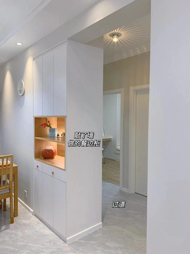 餐厅紧挨着厨房,缩短了移动距离,上菜打包都很方便。木质餐桌和椅子搭配米色桌布,钻石吊灯发出柔和的灯光,营造出非常温馨浪漫的用餐氛围,一部分侧墙被打掉,打造出一个餐边柜,采用分层设计,可以展示可存放的东西,不占地方。还包含了隐藏灯和饰品,起到了非常好的装饰效果,非常实用美观。