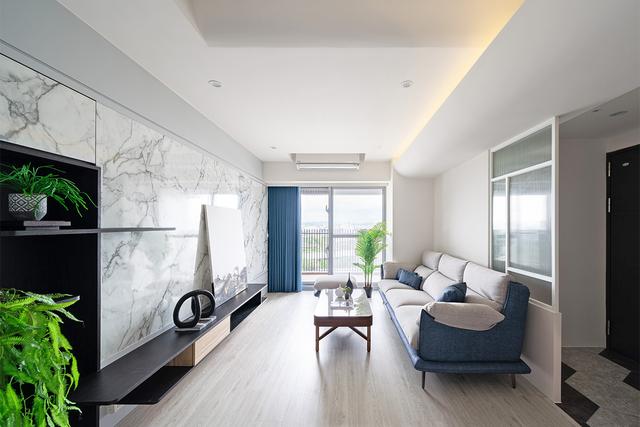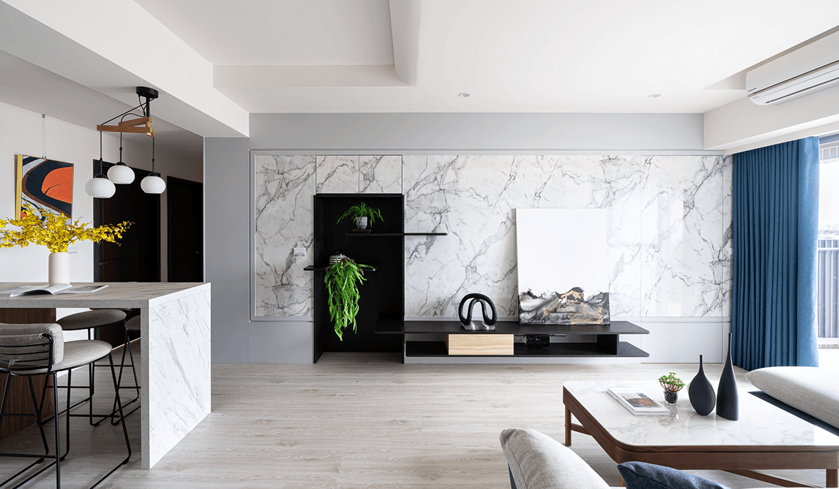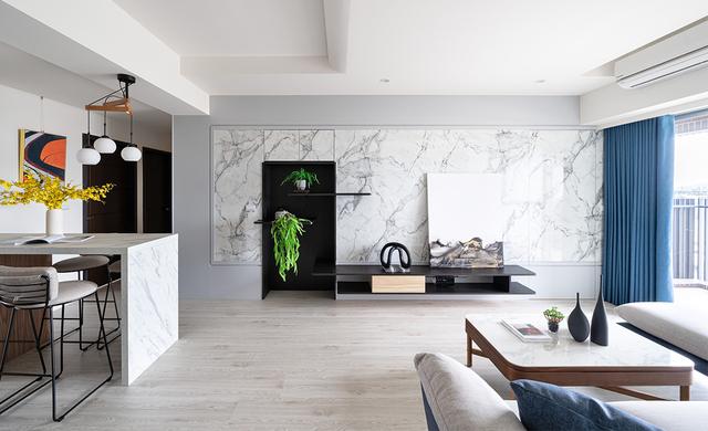 然后是客厅,客厅的电视背景墙也同步采用汉白玉纹理。