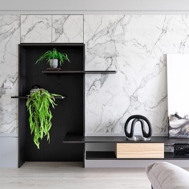 房子里还装饰了几盆新鲜的绿植,整个背景墙看起来层次分明,设计感很强。