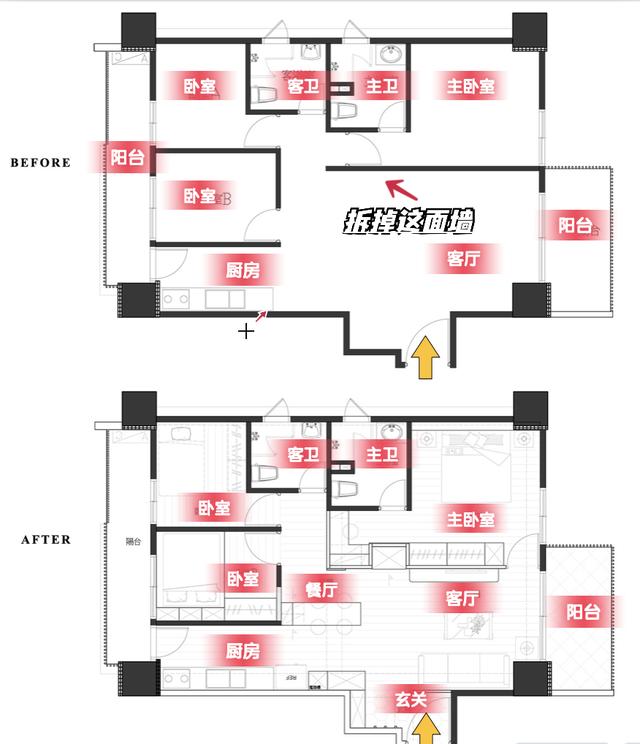 业主拆除了主卧和客厅之间的墙,改变了主卧门的入口位置。