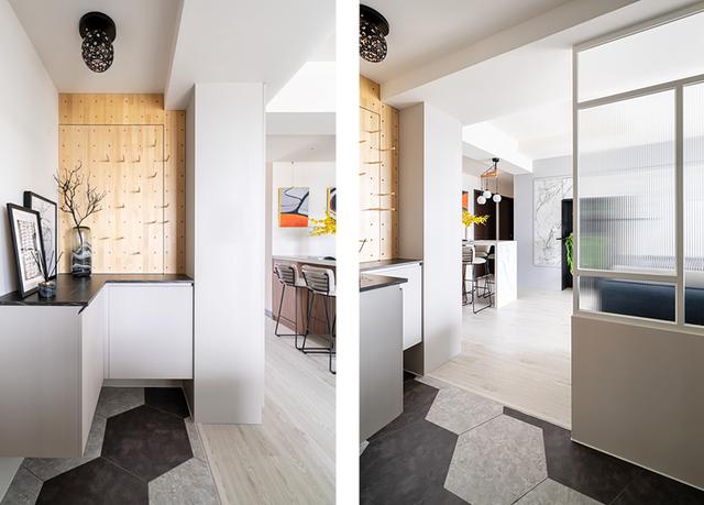 业主在电箱前加了一个孔板设计,巧妙隐藏,兼顾了放小物件、衣服帽子等生活功能。