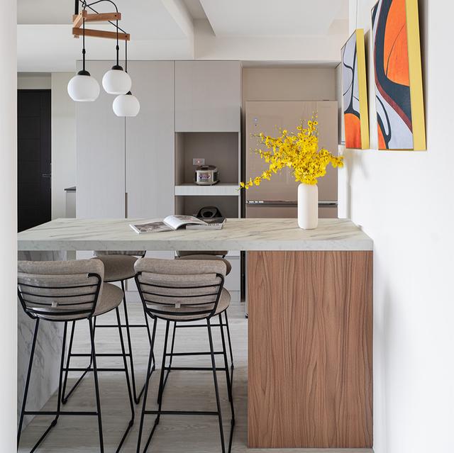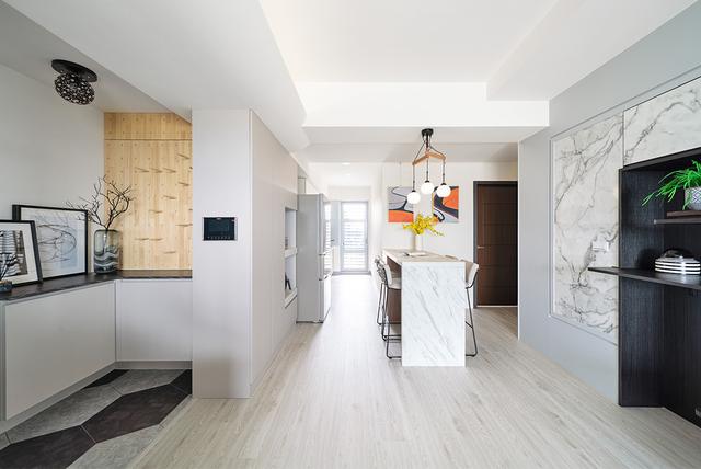 这样,餐厅和厨房就形成了一个线条流畅的长条形,整个家通透而规整。