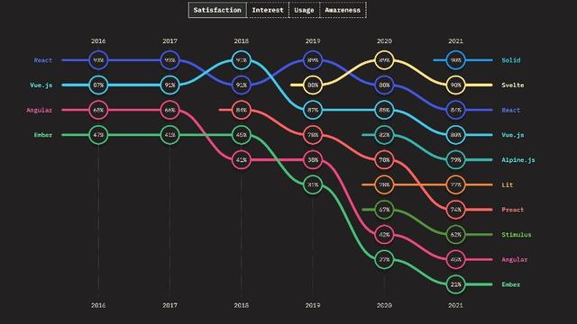 从专门 针对 JavaScript 的 2021 年度调查中可以发现,在 JavaScript 框架和库方面,React 的使用率继续领先,其次是 Angular 和 Vue.js。React 的满意度明显下降,在 Vue.js、Solid 和 Svelte 之后排名第四。Solid 在满意度方面排名第一,在兴趣方面排名第二,即使在实际使用它的人方面排名倒数第二。