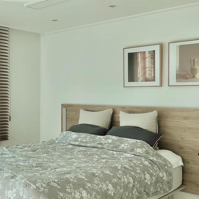 如果你觉得大面积的白色太单调,再加上两幅艺术画,整个卧室就有氛围感了。