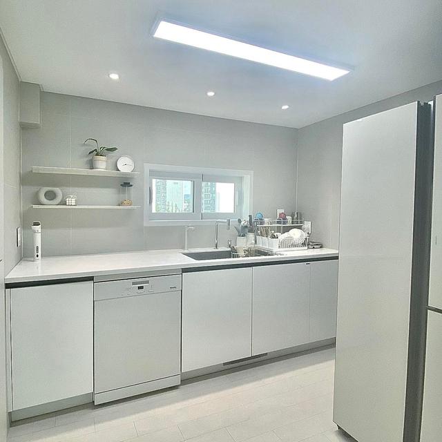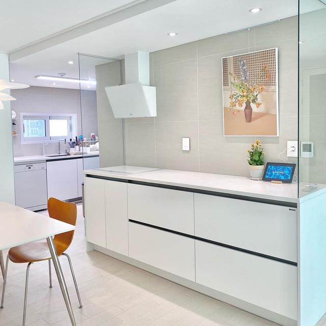 其实吊柜的收纳能力是非常有限的,所以大部分韩式厨房都没有吊柜的设计,这样会让空间更加宽敞明亮。
