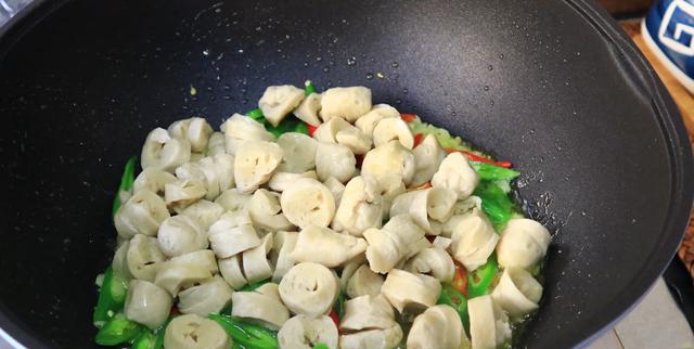 第四步、锅中倒入食用油,油热后倒入切好的配菜爆出香味,接着下入面筋翻炒,把面筋水分炒干,想要更有嚼头,可以把面筋炒得焦黄一些。