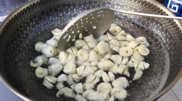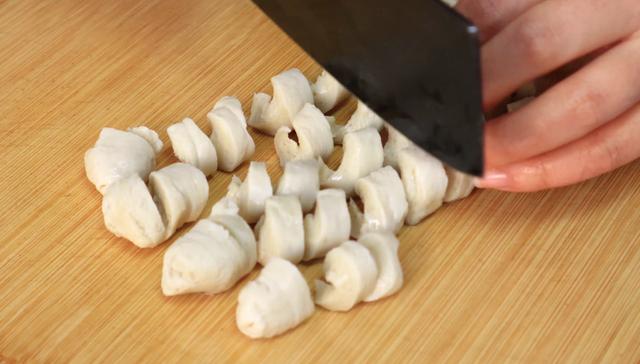 第三步、锅里水开之后下入切好的面筋,焯水2分钟,这样面筋炒得快,也容易入味。